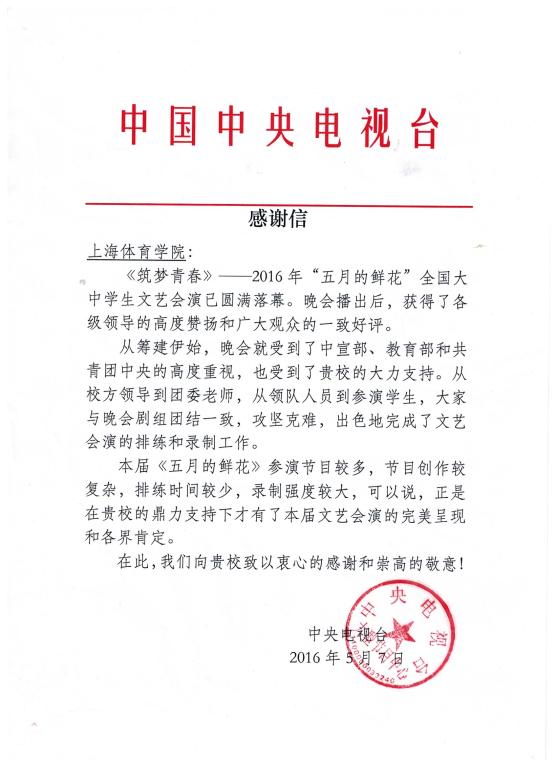5月4日,由中宣部、教育部、共青团中央联合主办,中央电视台一号演播大厅录制播出的“五月的鲜花”全国大学生文艺会演在央视一套、三套黄金时段播出,中宣部副部长景俊海、教育部副部长郝平、团中央书记处书记傅振邦亲临现场观看演出并作重要讲话,其中休艺学院体育舞蹈表演团和花样跳绳队共同完成的舞蹈《五月的鲜花》作为全场第一个节目绚丽呈现,获得一致好评。日前,学校收到中央电视台发来的感谢信,对我校参演本次文艺会演活动的付出与支持表示感谢。