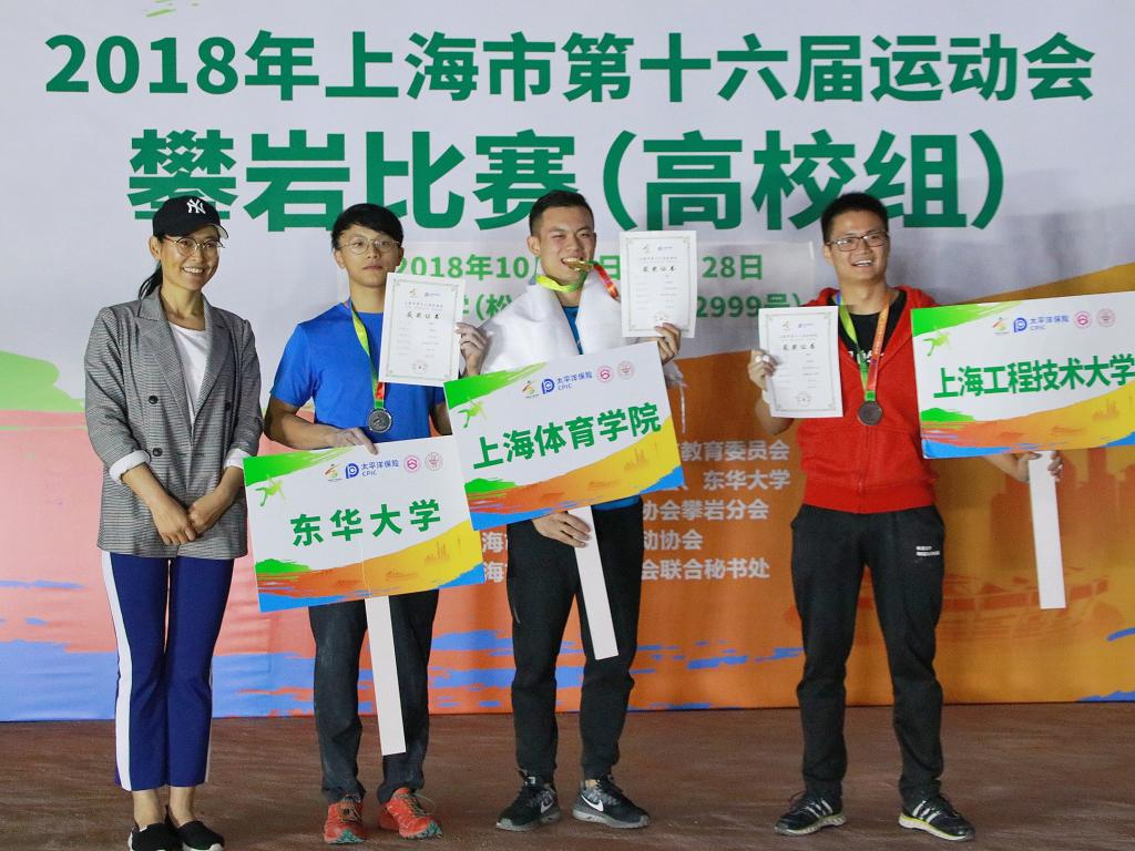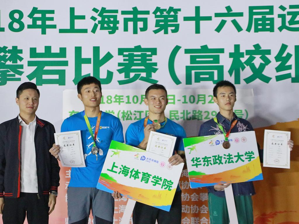 “太平洋保险杯”上海市第十六届运动会攀岩比赛(高校组)于10月27日至10月28日在东华大学松江校区举行。我校攀岩队武海涛、陆聪、禤秋妃、邹小育等12名队员在比赛中获5金1银2铜的优异成绩,包揽了男子项目所有金牌!