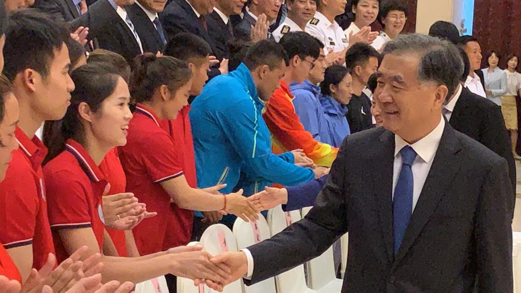在本次民运会中,全国政协主席汪洋、国务院副总理孙春兰、统战部长尤权及国家民委主任巴特尔等国家领导人接见运动员代表,我校《火彝绳花》壮族参赛队员韦冬玲有幸与国家领导人握手合影。韦冬玲表示非常感谢学校的培养,接见活动让她真切地感受到了习近平总书记提出的“各民族相互了解、相互尊重、相互包容、相互欣赏、相互学习、相互帮助,像石榴籽那样紧紧抱在一起”,爱国情怀油然而生。随后,参会的党员、预备党员、入党积极分子等进行了发言表态,在比赛的同时,将不断加强学习,持续提升思想认识,将“不忘初心、牢记使命”落实在每一场比赛上,切实将之内化于心、外化于形。