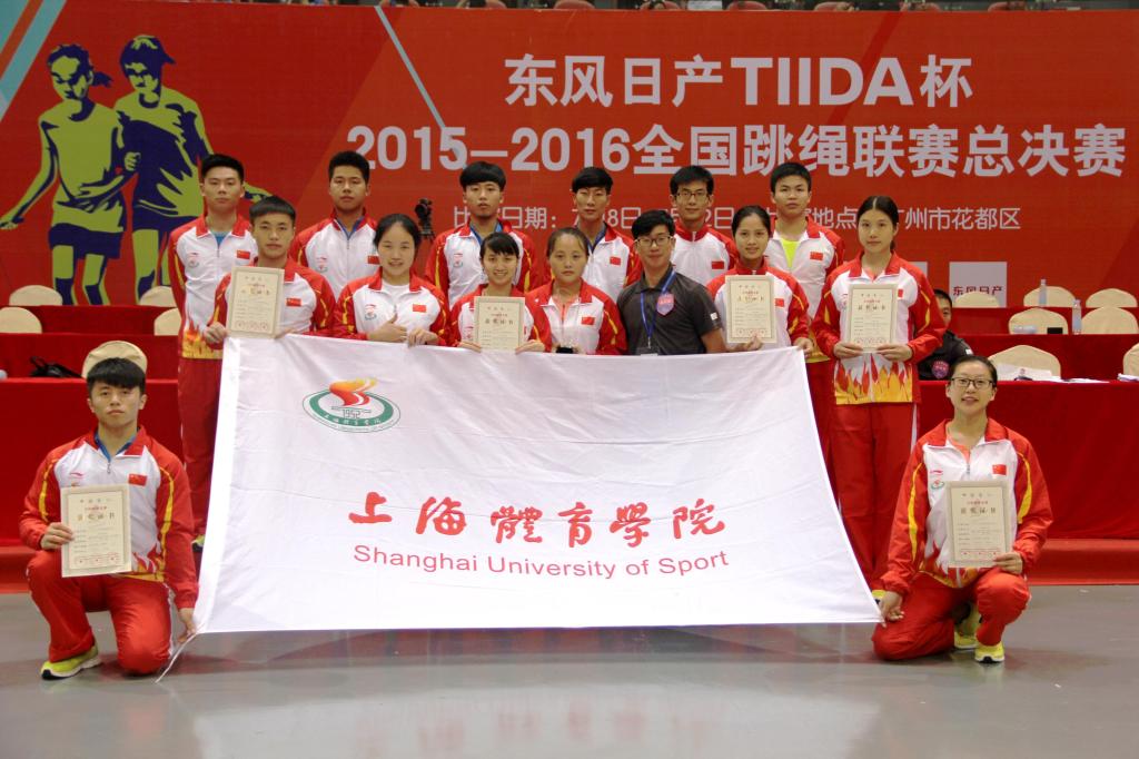 7月8日至12日,由国家体育总局社会体育指导中心、中国大学生体育协会、中国中学生体育协会联合主办的2016年全国跳绳联赛总决赛在广州花都东风体育馆隆重举行。我校花样跳绳院队14名队员以休艺学院刘树军副院长为领队,以韩耀刚为教练经过3天的激烈角逐,在速度赛中获得6枚金牌(30秒单摇、30秒双摇、4x45秒交互绳接力男子组、4x45秒交互绳接力女子组4、x30秒单摇接力、连续三摇跳),在花样赛中获得6枚金牌(个人花样、两人同步、四人同步、三人交互、四人交互、两人车轮),共计12枚金牌。