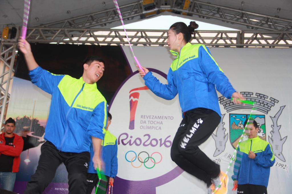 巴西里约时间8月1日清晨,奥运圣火来到巴西里约热内卢州(Rio de Janeiro)里约达斯奥斯特拉斯(Rio Das Ostras),韩耀刚老师带领7名队员作为唯一特邀国际演出团队参加了奥运火炬传递开幕式表演。经过精心编排,为现场的几千名巴西观众展现了一套时长近6分钟的演出,花样跳绳中融合了巴西特色桑巴舞蹈、中国功夫、京剧音乐、中国轮(Chinese Wheel)等众多元素,引起现场雷鸣般的掌声和啧啧称赞。