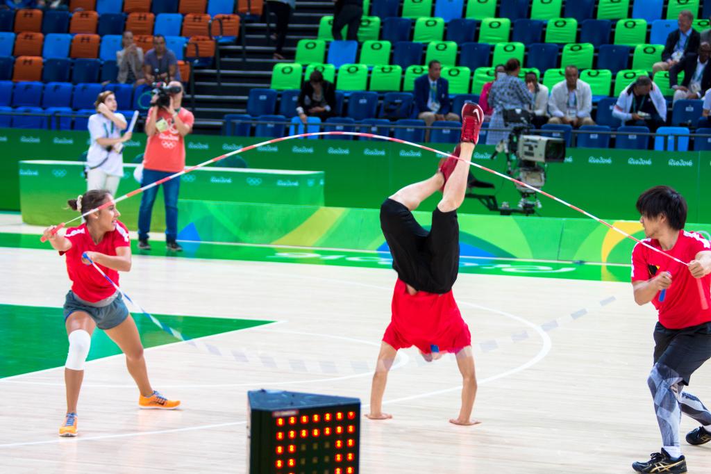巴西时间8月6日至8日三天,上海体育学院花样跳绳队携手上海跃动跳绳俱乐部及巴西跳绳世界冠军VIVIEN共同组成的奥运跳绳表演队由韩耀刚老师带队,在篮球比赛、手球比赛、击剑比赛中场成功演出10场,展示了五套不同风格及元素的节目,队员们激情高涨、活力四射,眼花缭乱的绳技融合巴西元素(桑巴舞)及中国元素(武术、京剧、中国车轮等)于一体,精彩的表演博得现场观众热烈的掌声和欢呼声。
