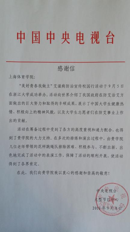 自七月中旬起,历时两个多月,来自体育休闲与艺术学院的7名同学在我校几位老师们的带领、指导下,多次赴杭州彩排演出。本次活动规格高、时间紧、任务重、强度大。期间,中央政治局委员、中央书记处书记、中央办公厅主任栗战书,国务委员、国务院党组成员、原外交部部长杨洁篪,外交部部长王毅,中央电视台台长聂辰席等各级领导亲临排练现场指导审查,并对演员以及演出效果都提出了更高的要求。在央视编导和我校韩耀刚老师共同指导下,反复修改,不断出新。我校学生积极应对、排除困难、一丝不苟,认真对待每一次排练及演出,积极展现上体人良好的精神风貌,多次获得导演组的赞扬。日前,我校收到了中央电视台发来的感谢信,对我校参演本次活动的付出与支持表示感谢。