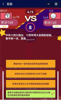 比赛过程中,答题系统会自动为参赛选手匹配对手,每轮共有5道题目,每题10秒钟作答时间,战胜对手可获取相应的团队贡献值。题目多以党史和团史的基本知识为主,包括党的基本路线方针、共青团的由来、马克思主义理论中国化的成果等内容,促使同学们通过线上答题对战的形式,认真学习理论知识,进一步了激励广大青年解放思想、与时俱进。