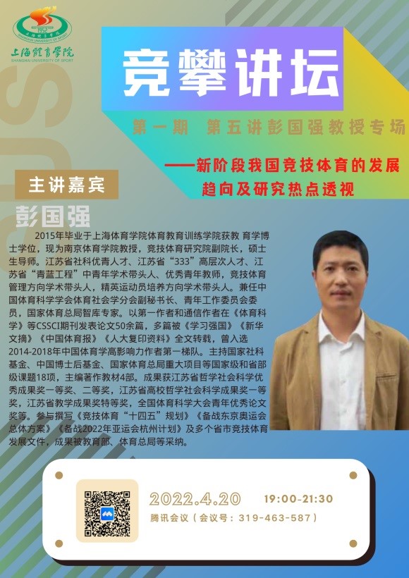 竞攀讲坛第一期(第五讲),将会在4月20日(周三)晚19:00正式开始,邀请到南京体育学院彭国强教授为大家带来《新阶段我国竞技体育的发展趋向及研究热点透视》的学术分享,欢迎大家积极参与学习交流。