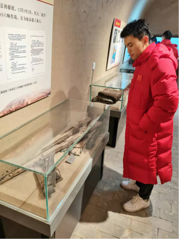 1月6日,体教专业赴甘肃省参加招考工作的师生在相关工作第一阶段结束后,专程赶赴庆阳市环县曲子镇,在陕甘宁革命根据地的重要组成地——曲子革命纪念馆开展党史学习教育。曲子革命纪念馆负责人、红军烈士后代刘正正同志、红军烈士后代刘凯坤同学、体教本科生党支部书记许丁晨老师和参加本次工作的学生党员、退伍学生代表等十余人共同参加教育活动。
