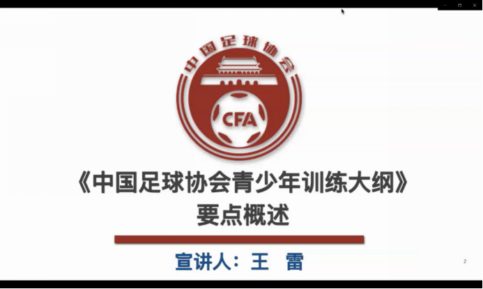 在宣讲开始前,足球教学团队负责人陶然成对于王雷指导的线上宣讲表示热烈欢迎,也指出《青训大纲》是代表目前国内最先进训练理念的指导性文件。希望足球专项的同学认真听课,课后认真研读大纲,以保证自己与国内先进的训练理念保持一致。
