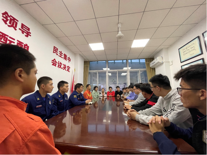 双方在队站会议室进行了热情友好的交流,张吉欢对翔殷站的基本情况作了介绍,许丁晨对体教支部近年来取得的成绩作了回顾,特别对双方党支部共建、团支部共建提出了大量可操作性的办法,对后续继续加强党团组织联系做出了时间和工作规划;翔殷站各战斗班班长与学生党员、学生干部进行了深入交流,就思想建设、日常工作和消防员招录政策条件等进行充分沟通。