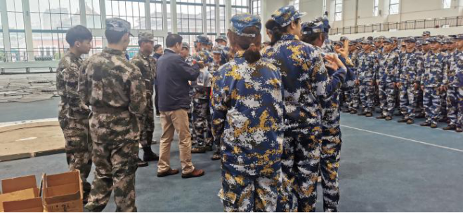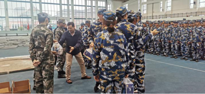 随后,学院领导们开始给学生们分发军训慰问品,印着黄色笑脸的透明塑料袋里承载的不只是慰问物品,更多地是学院对我们的关怀之心。