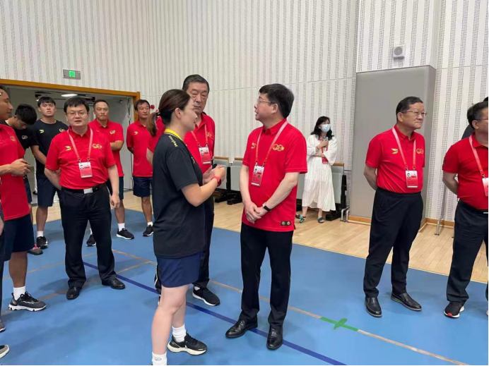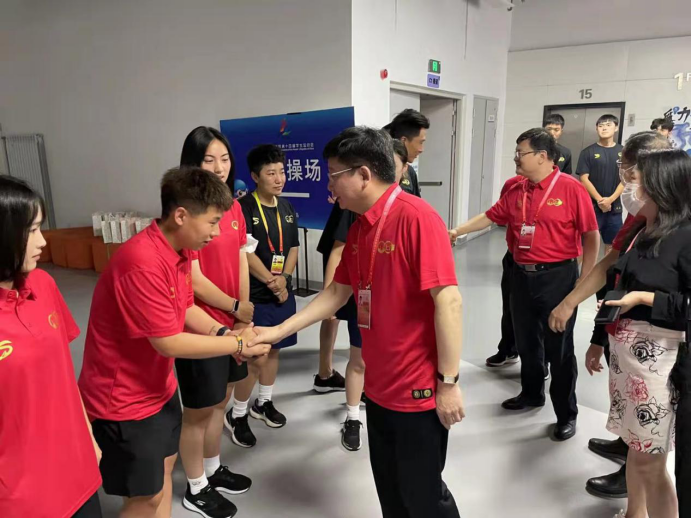 7月13日,上海市副市长陈群,上海市教委主任王平,上海市大学生体协会长薛明扬,上海市教委副主任倪闽景,原上海体育学院院长、上海学生运动会代表团副团长姚颂平,上海市教委办公室主任赵宁,上海市教委体卫艺科处处长陈华和上海市科技艺术教育中心主任陆晔一行,在青岛中学室内体育馆亲切慰问了上海市足球代表队。其中,上海市大学生女子足球代表队是由我校为班底的15名球员组成,由我校体育教育训练学院党委书记徐烈担任领队,体育教育训练学院教师叶志竞担任主教练。昨天小组最后一场比赛,上海参加的三支足球队伍均以小组第一的身份进入前8名。陈市长在慰问时讲道,记得2017年刚到上海担任副市长时,天津全运会上我们上海足球男女足都拿到了冠军,实现上海足球大满贯,也希望这次能再创辉煌!
