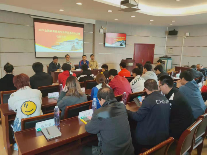 4月13日中午,体育教育训练学院在1111会议室召开2021年全国体育教育专业学生基本功大赛动员大会,学院领导班子、办公室、教练员和指导教师及18名集训备战基本功大赛的学生参加了会议。院长高炳宏主持了会议,并做动员讲话。他着重强调了我校参加此次比赛意义与价值,并全面而细致的解答了18名同学的相关问题。党委书记徐烈在会上指出,要全面配合做好后勤保障工作,包括学生训练、学习、课程等具体问题。党委副书记、副院长曹智超提出以赛促学等鼓励学生调整态度。另外,刘善德老师和舒盛芳老师专门针对技术和理论学科的训练、学习安排进行解释。最后,高炳宏院长详细布置了教练员、指导教师的遴选等工作。