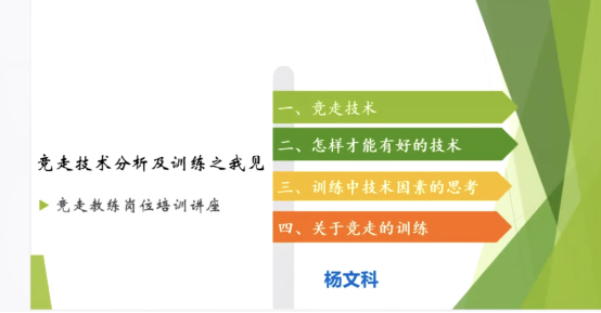 12月12日,内蒙古竞走教练员杨文科老师以《竞走技术分析及训练之我见》为题进行授课。杨文科老师首先介绍了“竞走技术”的定义,其次分别从从竞走技术、怎样提高竞走技术、训练中技术因素的思考和关于竞走训练四个方面进行讲解。本节课重点强调在竞走训练中应以以完整技术训练为主,并与分解技术相结合。