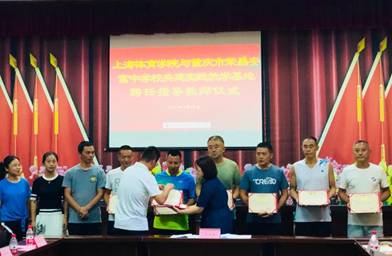 接下来举行了上海体育学院体育教育训练学院与荣昌安富中学共建教育实习基地签约、授牌暨指导教师聘任仪式,随后,荣昌安富中学指导教师代表韩刚和上海体育学院实习学生代表唐庭欢分别进行发言。