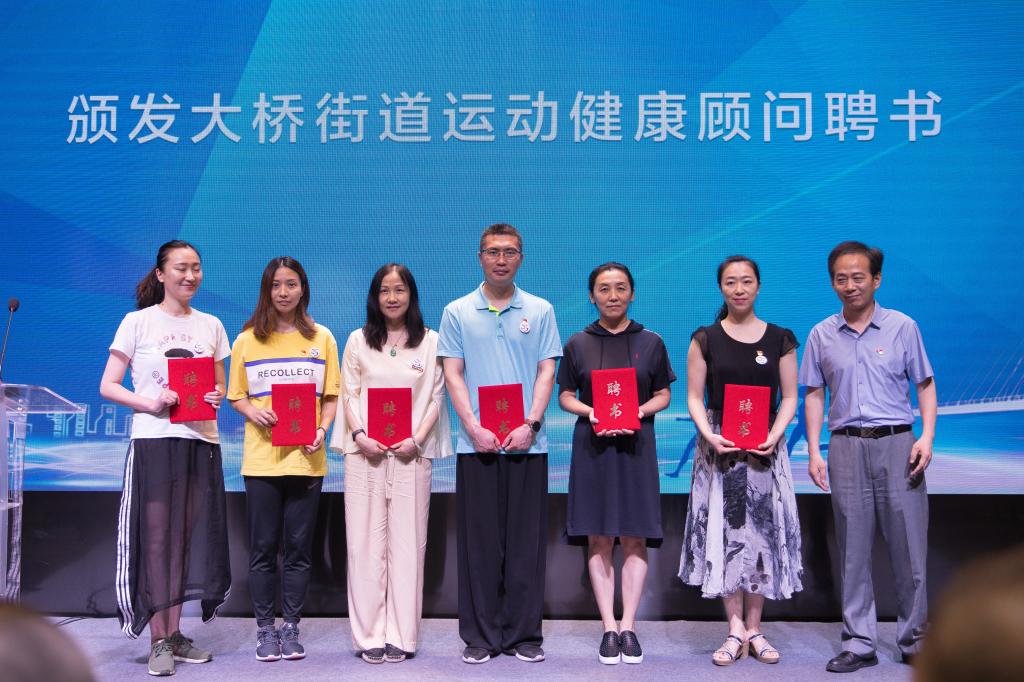 上海体育学院体育舞蹈专家代俊、广场舞排舞专家陆颖娜、养生气功专家王震等教师上台接过了大桥街道运动健康顾问的聘书。今后,他们不仅是上海体育学院的教师,更成为了定期为大桥街道体育团队提供技术指导的“社区健康师”。