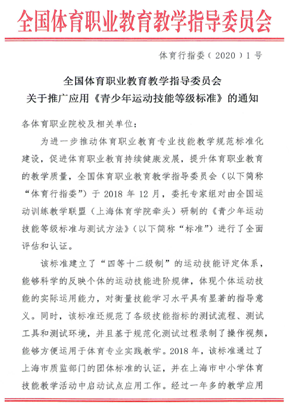 近日,全国体育职业教育教学指导委员会(以下简称“体育行指委”)在委托专家进行全面评估和认证的基础上,采纳《青少年运动技能等级标准与测试方法》(以下简称《标准》)作为全国体育职业院校学生体育专项课程学习掌握情况、教师体育专项课程教学成果、教育活动中青少年运动技能掌握情况、自主招生考试体育专项技能测试、体育类专业“单考单招”体育技能测试的评价标准,并拓展到其他体育职业教育活动中进行应用。
