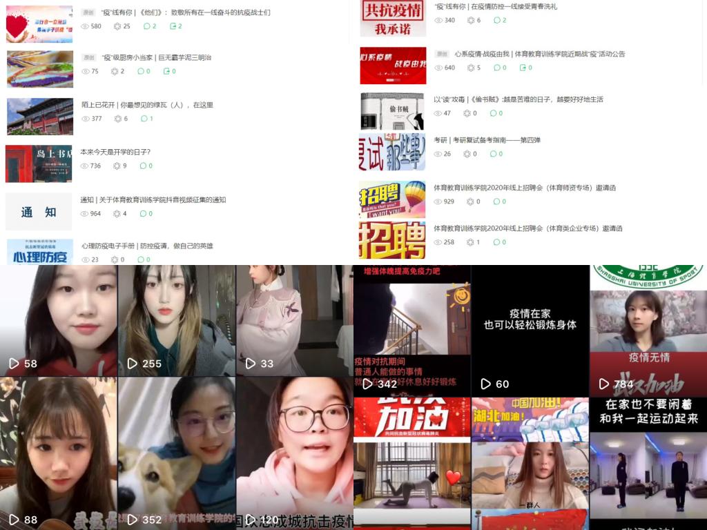 与此同时,体育教育训练学院也组织开展以“学”战疫,共克时艰——21天打卡,知行合一立担当,体训学子抗战“疫”——“疫”线有你系列志愿者征集,运动防疫——居家健身小贴士,“疫”级厨房小当家——宅家美食分享,以“读”攻毒——线上主题读书观影分享,“疫”若黑夜、“你”若辰星——体训之家抖音视频征集等多项活动,让学生在这段特殊时间里,通过学习、锻炼、看书、做饭等方式与大家分享乐趣。
