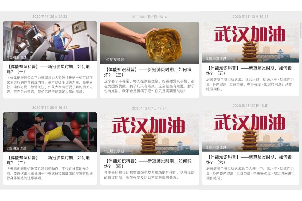 自2020年1月26日起,上体体能公众号陆续发布六篇系列专业科普运动指南——“新冠肺炎时期,如何锻炼?”陆续推送居家锻炼的运动内容,基本以徒手训练为主,简单易行,操作方便。用户还可在后台留言互动,尽己所能满足大家的训练需求。