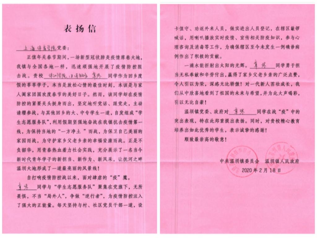 近日,我校还收到了温圳镇镇委和镇政府的表扬信,2018级体育教育专业的章琴寒假回乡后,面对新冠疫情主动请缨,与其他回乡学生一起自发组成“学生志愿服务队”,积极投身新冠疫情防控工作,为守护家乡父老乡亲的幸福安康而战。