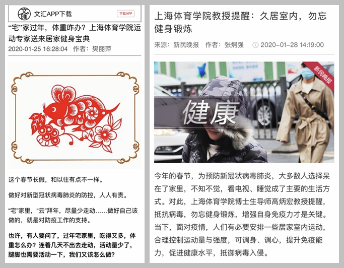 体训学院在积极贯彻学校联防联控工作要求的同时,坚决贯彻“三个全覆盖”“三个一律”“三个强化”工作要求,进一步加大防控力度,严防死守,努力打好防疫攻坚战,立足学科专业优势,依托微信公众号等平台及时发布专业的健身科普和心理咨询推送,服务全市联防联控工作,积极引导师生做科学防控的践行者和健康上体的守护者,展现上体人身心一统的良好形象,相关资讯和内容在《人民日报》、《解放日报》、《文汇报》、《新民晚报》、《新闻晨报》等媒体平台上报道。