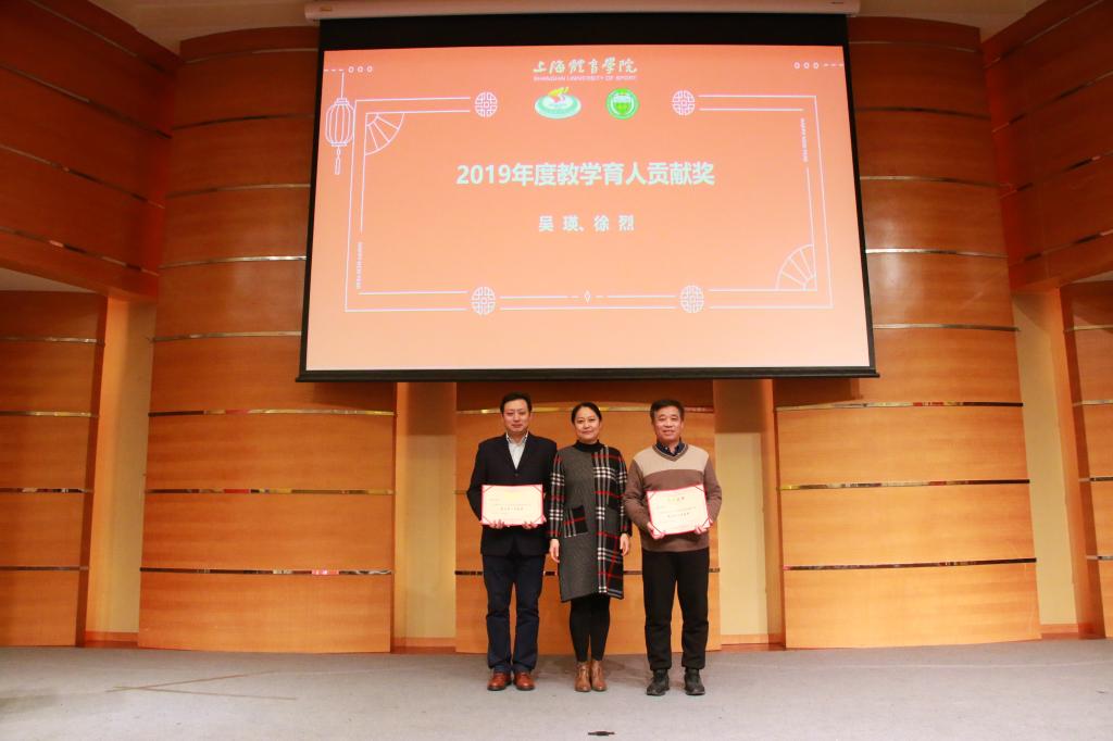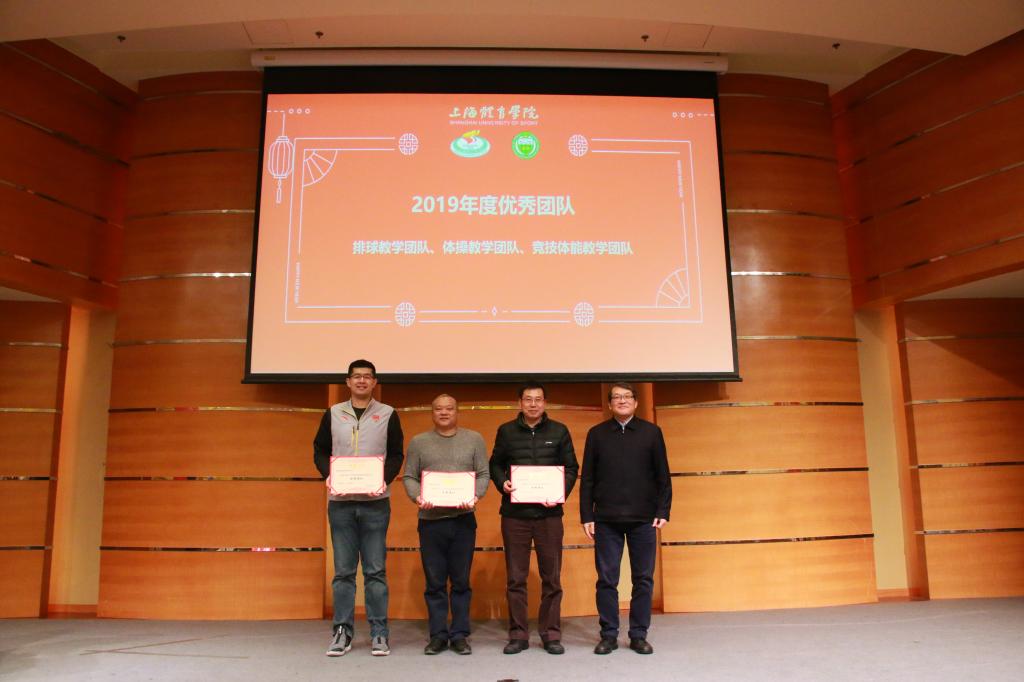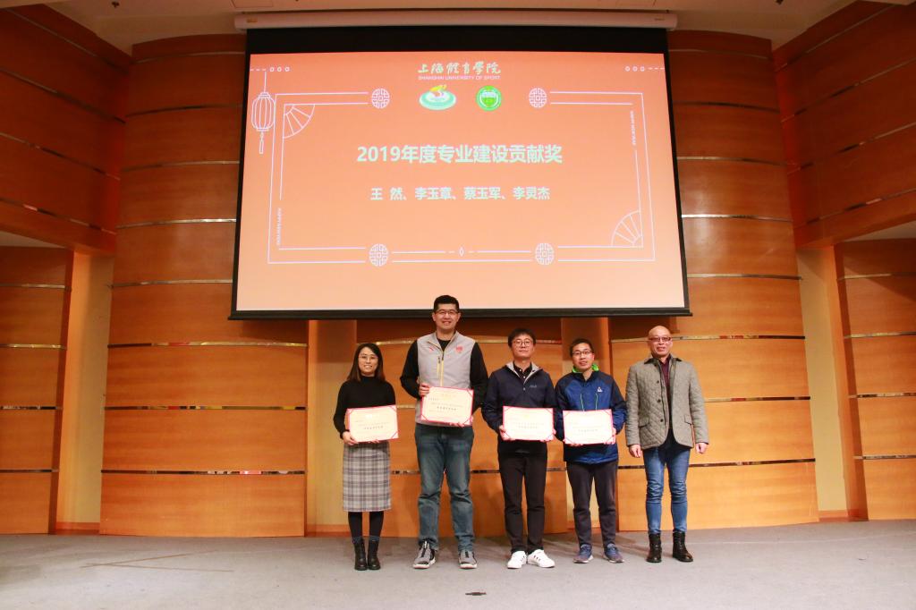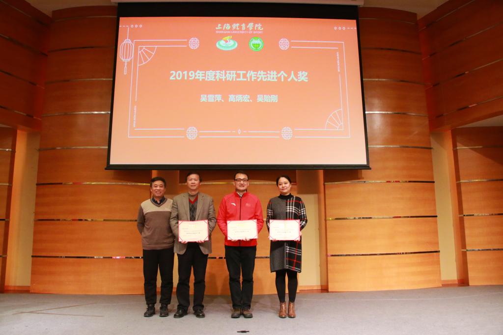 为鼓励和感谢我院教师为学院建设一年来的支持与贡献,会上举行了隆重的表彰仪式。吴瑛教授为吴雪萍、高炳宏及吴贻刚颁发了2019年度科研工作先进个人奖;丁海勇教授为高炳宏和刘阳颁发了2019年度课程建设贡献奖;蔡玉军院长为黎涌明、潘黎君颁发了2019年度教学竞赛贡献奖;曹智超书记为吴瑛、舒盛芳等教师颁发了2019年度教学竞赛优秀指导教师奖;高炳宏院长为李菁、修晨等教师颁发了2019年度训练竞赛贡献奖;张盛海教授为王然、李灵杰等教师颁发了2019年度专业建设贡献奖;陈佩杰院长为王丹颁发了2019年度学科建设贡献奖;吴雪萍教授为吴瑛和徐烈颁发了2019年度教学育人贡献奖;陈佩杰院长为排球、体操、竞技体能教学团队颁发2019年度体训优秀教学团队奖。
