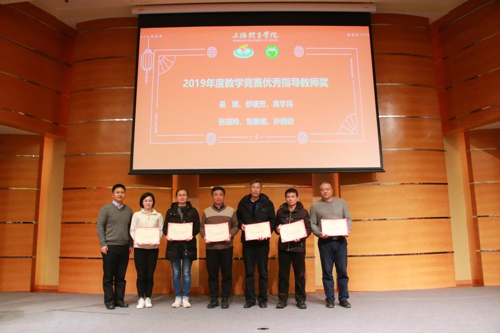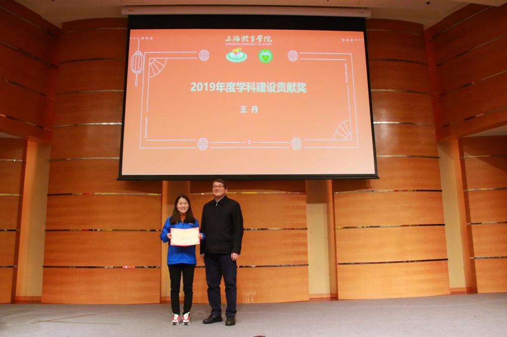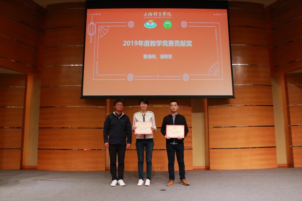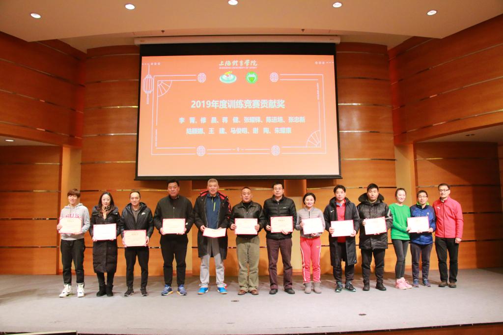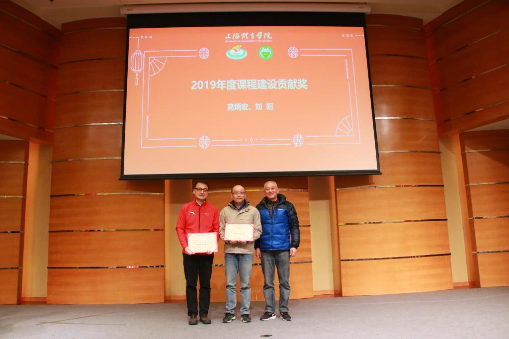 为鼓励和感谢我院教师为学院建设一年来的支持与贡献,会上举行了隆重的表彰仪式。吴瑛教授为吴雪萍、高炳宏及吴贻刚颁发了2019年度科研工作先进个人奖;丁海勇教授为高炳宏和刘阳颁发了2019年度课程建设贡献奖;蔡玉军院长为黎涌明、潘黎君颁发了2019年度教学竞赛贡献奖;曹智超书记为吴瑛、舒盛芳等教师颁发了2019年度教学竞赛优秀指导教师奖;高炳宏院长为李菁、修晨等教师颁发了2019年度训练竞赛贡献奖;张盛海教授为王然、李灵杰等教师颁发了2019年度专业建设贡献奖;陈佩杰院长为王丹颁发了2019年度学科建设贡献奖;吴雪萍教授为吴瑛和徐烈颁发了2019年度教学育人贡献奖;陈佩杰院长为排球、体操、竞技体能教学团队颁发2019年度体训优秀教学团队奖。