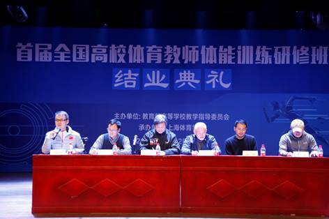 最后的结业典礼上,教育部全国高等学校教育教学指导委员会顾问孙麒麟教授、教育部全国高校体育教学指导委员会刘海元秘书长、教育部全国高等学校体育教学委员会工体组副组长刘波教授、国家体育总局体育科学研究所闫琪研究员、上海体育学院体育教育训练学院院长丁海勇教授、副院长高炳宏教授出席。刘海元秘书长指出:目前我国高校部分大学生体质还有待于进一步强化,适时出现的体能训练正是提高学生体质健康有效途径,体能训练在大学中如何开展、如何成为一种有成效的教学手段、如何提高教学效率将成为提高学生体质的新手段、新方法,也是各位一线体育教师应该思考的问题。希望通过本次培训,可以以培训教师的一个点,带动学校的一个面,提高体育课的授课质量,对学生体能、体质有所促进,这也是本次体能训练研修班最核心的目的。孙麒麟教授阐明了学生在体育锻炼中享受乐趣、增强体质、健全人格、锤炼意志,体能训练是有效的载体手段。本次培训活动在提升了高等学校体育教学工作质量、提升教育内涵的同时,也进一步提高了专业体育教师专业水平、开拓了视野,为使教师了解和掌握更多的科学有效训练方法,掌握体育领域的先进的前沿的知识理念,搭建了很好的平台。丁海勇教授寄语各位学员,希望各位老师能借由此次培训,关注体能训练,在体能训练和体育教学中取得更好的成绩。最后,体育教育训练学院副院长高炳宏教授总结讲话:在三天的学习中,总能见到学员依依不舍的和讲师沟通交流的情景,这也侧面体现了本次培训的价值。作为培养体育老师的老师,希望通过本次体能训练研修产生思想碰撞的火花,使我们的体育课变得更加的多样和丰富,能够以体能训练为基础,以技能学习为核心,让体育课变成改善学生体质的有效途径。