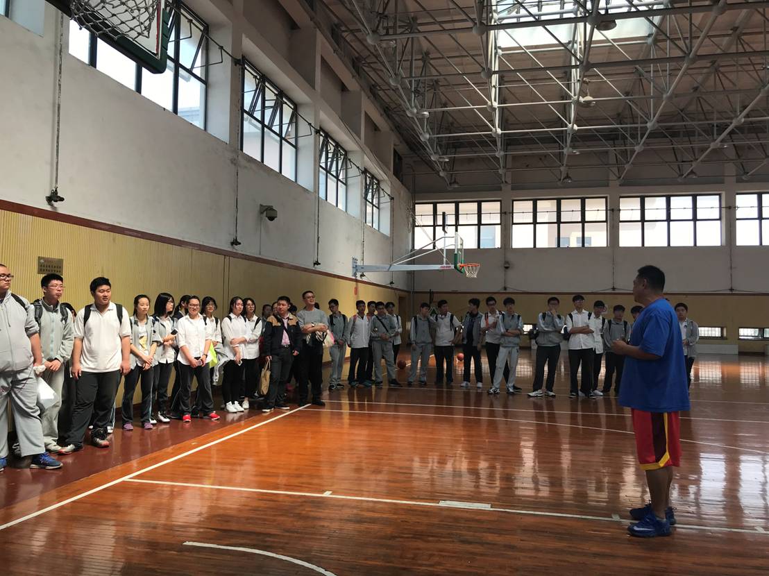 许丁晨老师、体训学生会副主席钱晓婉与体教专业本科生党员代表陪同五十二中师生参观了中国武术博物馆、室内田径馆等场馆,观摩了篮球、排球、网球、体操等专项教学课。在篮球馆,上海市“青年五四奖章个人”获得者孙伟老师向参加观摩的学生简要讲述了赴老挝担任国际志愿者的工作历程,并深情勉励在场同学要将自己的个人梦想与中国梦相结合,为祖国的富强贡献自己的力量。
