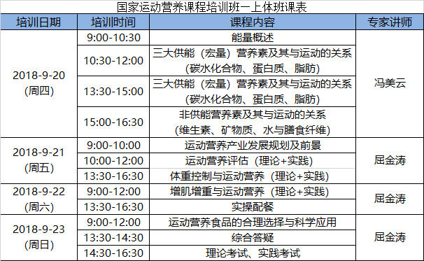 该培训认证课程是由中国食品科学技术学会运动营养食品分会开发的课程,在业内具有极高的认可度。本课程主要目的是,让每位学员都能掌握使用运动营养知识与技能,为自身和目标群体制定个性化运动营养计划,提升自我及目标群体健康水平及训练效果。2018年第一期拟于9月20日——23日举行,相关报名信息与要求具体如下: