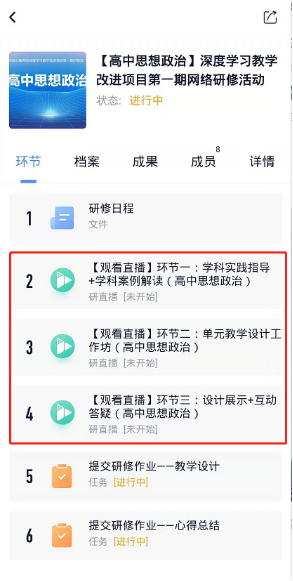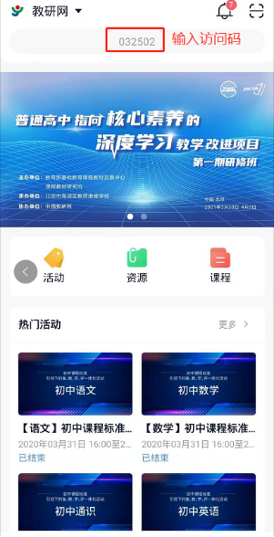 3.搜索对应活动访问码进入相应学科,点击【观看直播】进入直播页面(高中体育与健康代码为:779683)。
